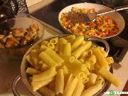Tak przygotowany sos czosnkowy mieszamy z ugotowany, odcedzonym makaronem, posiekanym lubczykiem i tartym żółtym serem. Następnie wkładamy do naczynia żaroodpornego wysmarowanego oliwą.