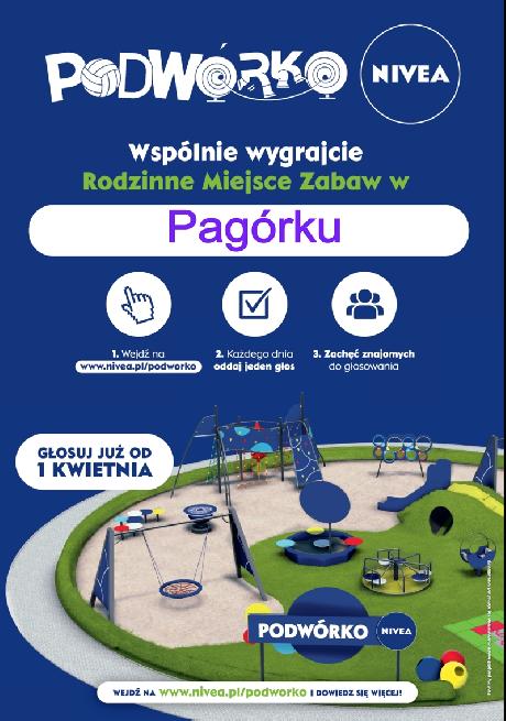 Jako lokalizację wskazany został teren pod planowaną budowę Domu Kultury w miejscowości Pagórek. To czy podwórko Nivea powstanie w miejscowości Pagórek zależy od głosowania internetowego. Im więcej głosów oddamy na naszą lokalizację tym większa szansa na znalezienie się w gronie 40 miejsc, w których firma Nivea wybuduje nowoczesne place zabaw dla dzieci.